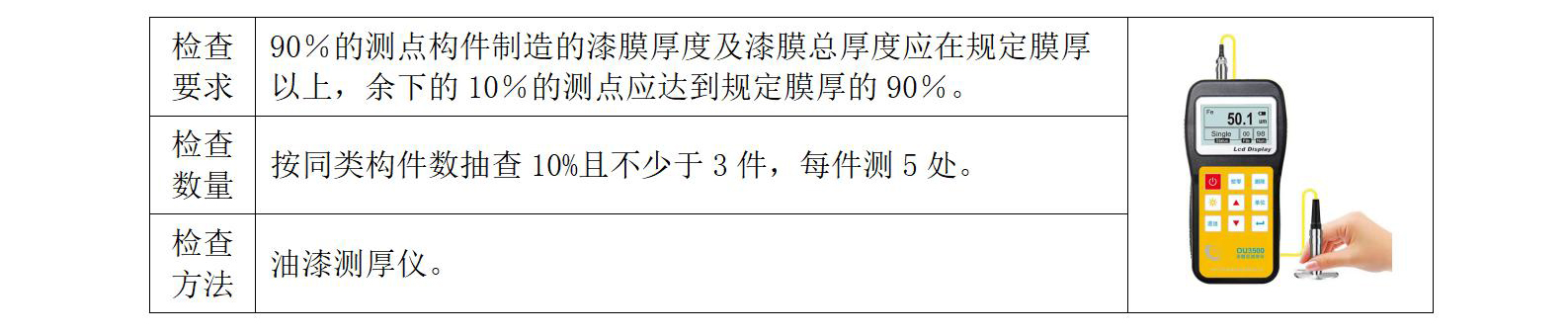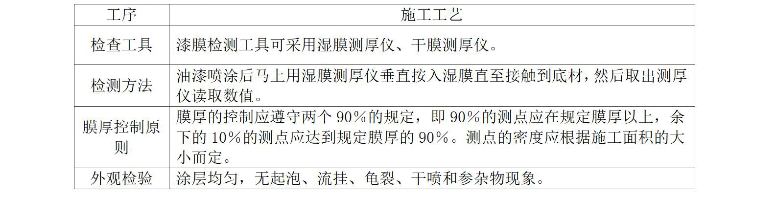 漆膜厚度是使防腐涂料能够发挥最佳性能,足够漆膜厚度是极其重要的。因此,必须严格控制厚度,施工时应按使用量进行涂装,经常使用湿膜测厚仪测定湿膜厚度,油漆干燥后采用超声波测厚仪测量,以控制干膜厚度并保证厚度均匀。